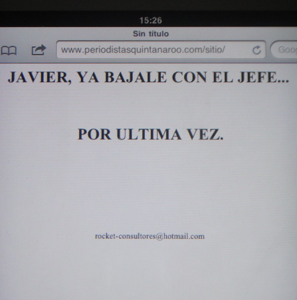 Este lunes 10 de septiembre, fue hackeado el portal http://www.periodistasquintanaroo.com/ del periodista Javier Chávez Ataxca (corresponsal de La Jornada en Chetumal) con una leyenda que decía “Javier, ya bájale con el jefe… por última vez”, firmado por rocket-consultores@hotmail.com El portal hoy se encuentra fuera de línea.