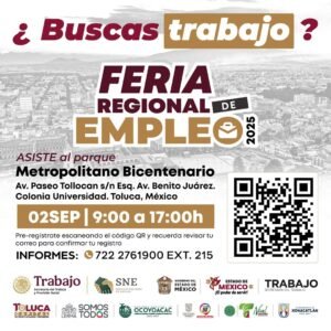 TOLUCA, Estado de México, 1 de septiembre de 2025.- El Gobierno municipal de Toluca invita a la segunda Feria Regional de Empleo 2025, que se llevará a cabo el mañana martes 2 de septiembre en el Parque Metropolitano Bicentenario de 8:00 a 17:00 horas. Esta es una excelente oportunidad para quienes buscan mejorar su situación laboral.
