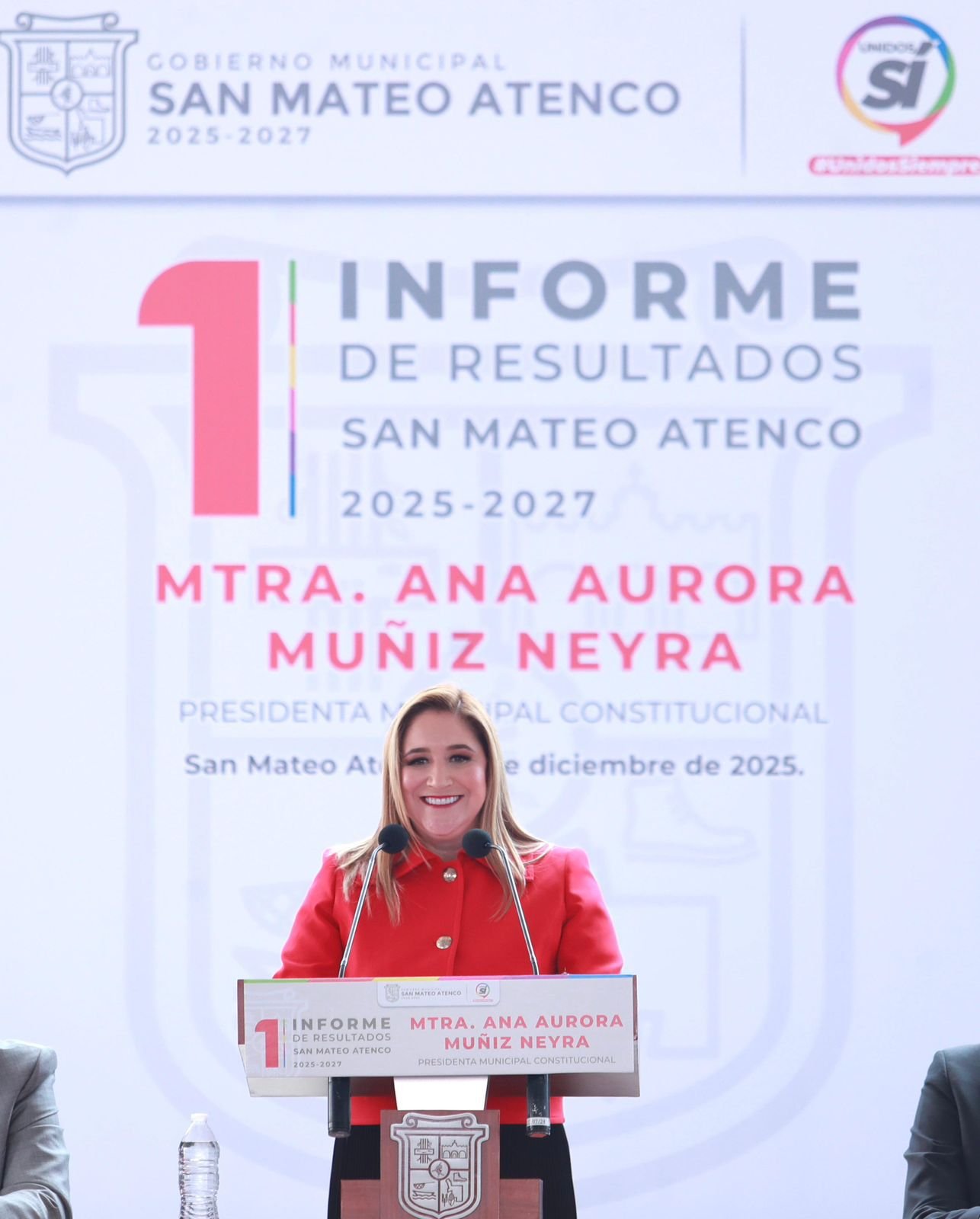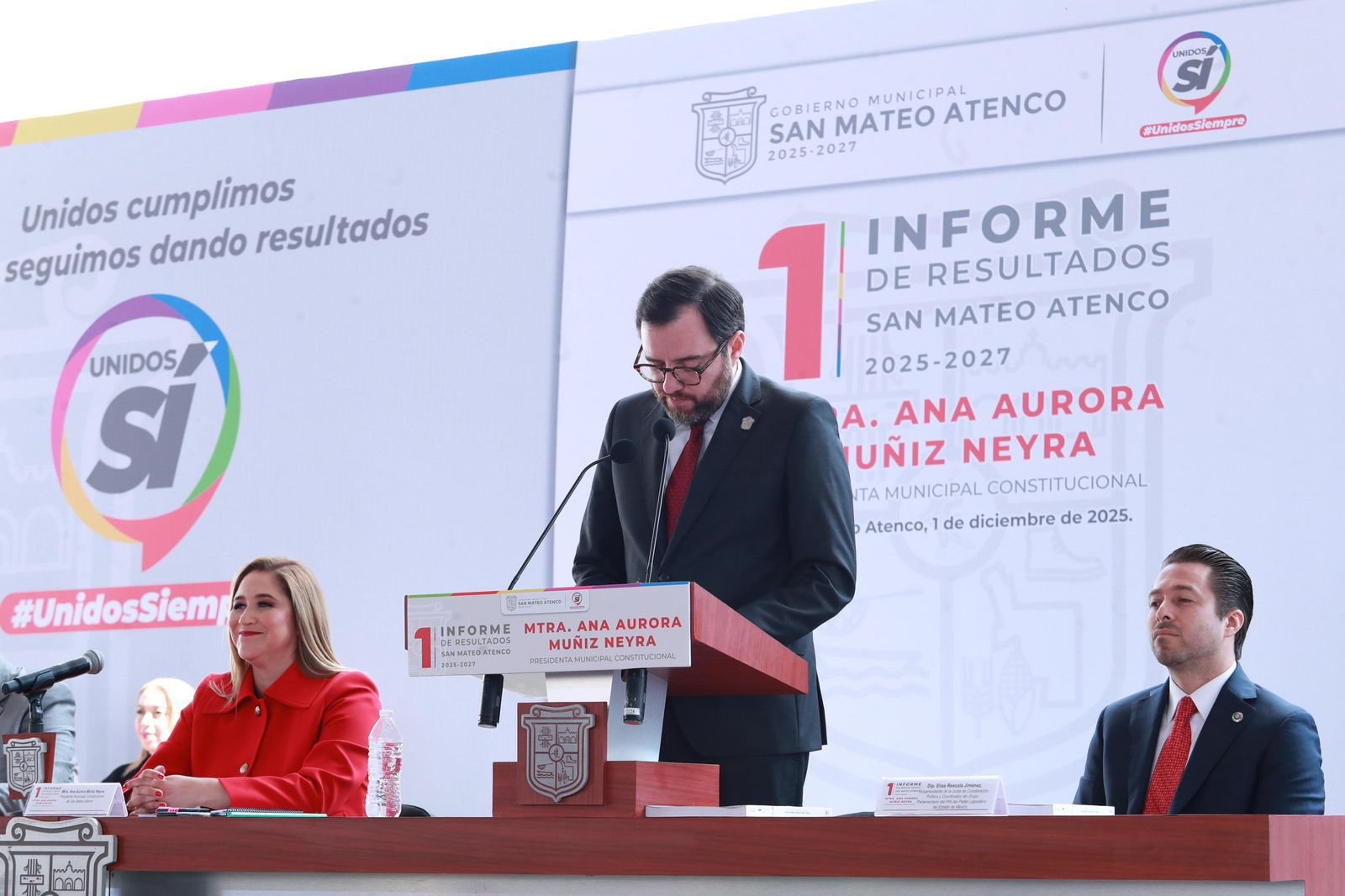 SAN MATEO ATENCO, Estado de México. – “Los atenquenses estamos resueltos a seguir la ruta del desarrollo, unidos y decididos a llevar a nuestro municipio hacia un futuro de igualdad y progreso, sin dejar a nadie atrás”, así lo afirmó la presidenta municipal Ana Aurora Muñiz Neyra, al rendir el Primer Informe de Resultados de la administración 2025-2027.