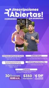 TOLUCA, Estado de México. – Con el propósito de promover la inclusión, sensibilizar a la sociedad y recaudar fondos para la adquisición de aparatos funcionales destinados a niñas, niños, jóvenes y personas adultas con discapacidad en situación de vulnerabilidad, el Gobierno municipal y el Voluntariado DIF Toluca invitan a la ciudadanía a participar en la carrera con causa Corriendo sin Barreras.