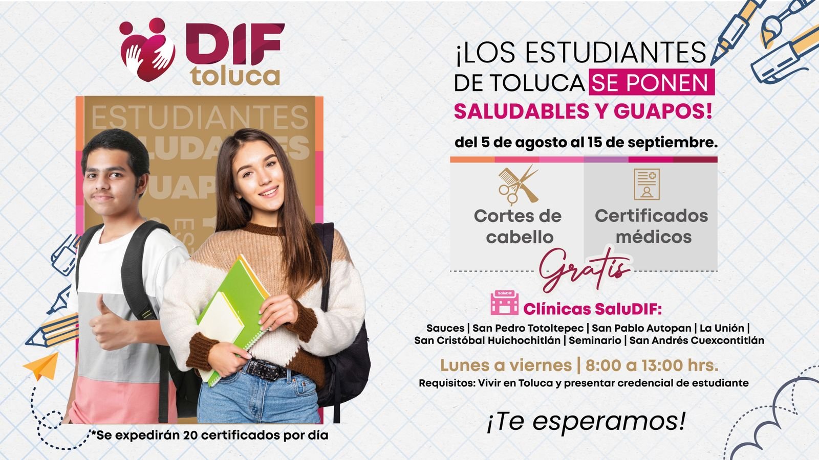 Quienes estén interesados en acceder a estos beneficios deben vivir en Toluca y tener credencial escolar vigente y presentarse en las clínicas ubicadas en Sauces, San Pedro Totoltepec, San Pablo Autopan, La Unión, San Cristóbal Huichochitlán, Seminario y San Andrés Cuexcontitlán, hasta el 15 de septiembre, en un horario de 8:00 a 13:00 horas, ya que se expedirán hasta 20 certificados médicos por día.