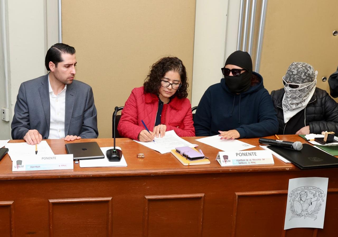 TOLUCA, Estado de México. – En un ejercicio de diálogo abierto y corresponsabilidad institucional, se llevó a cabo la asamblea con la comunidad estudiantil de la Facultad de Derecho de la Universidad Autónoma del Estado de México, con la asistencia de la rectora, Dra. Martha Patricia Zarza Delgado, en compañía del Dr. Jorge Alejandro Vásquez Caicedo, titular de la Secretaría de Gobernanza Universitaria.