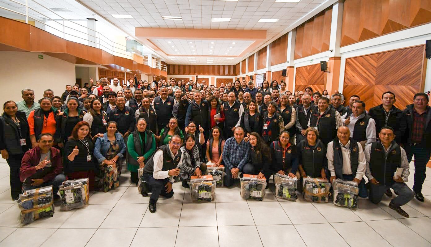 TOLUCA, Estado de México. – Herminio Cahue Calderón, secretario general del Sindicato Único de Trabajadores de los Poderes, Municipios e Instituciones Descentralizadas del Estado de México (Suteym), encabezó la entrega de equipo de trabajo a 212 delegaciones del sector central, provenientes de 23 municipios de la zona, que benefició a 9 mil 668 sindicalistas.