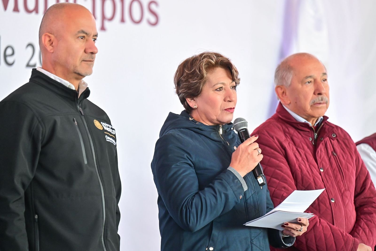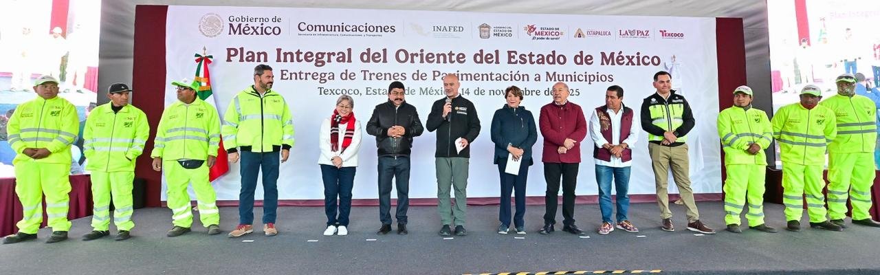 TEXCOCO, Estado de México. – La Presidenta de México, Claudia Sheinbaum Pardo y la Gobernadora del Estado de México, Delfina Gómez Álvarez realizaron el banderazo de salida de tres de los diez nuevos Trenes de Pavimentación para los municipios de Texcoco, Ixtapaluca y La Paz, como parte del Plan Integral del Oriente del Estado de México. Este proyecto tiene una inversión de 500 millones de pesos en maquinaria, para 10 municipios de la región.