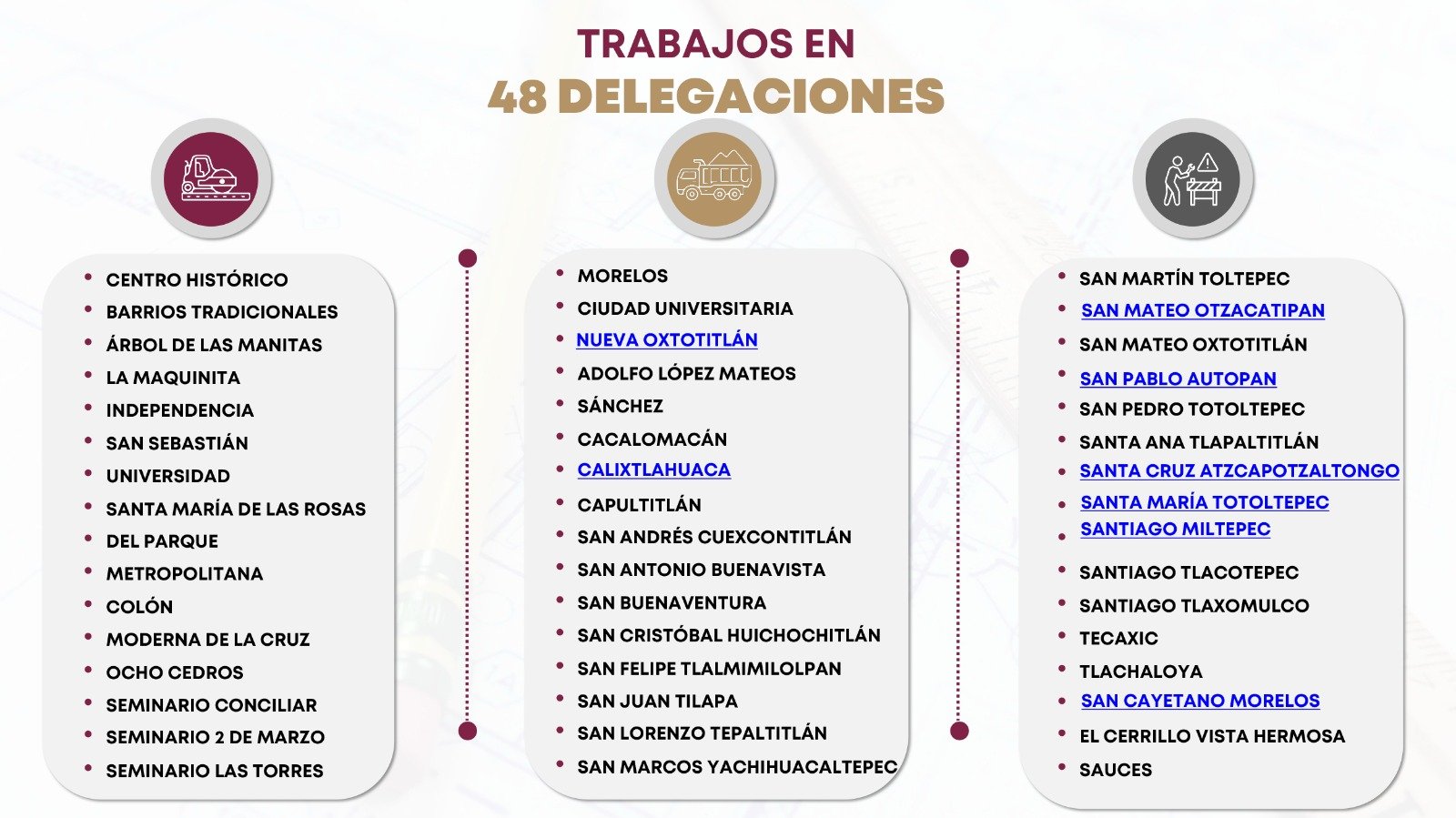 El arranque del programa se llevó a cabo de manera simultánea en las 48 delegaciones y para constatar el inicio de los trabajos, se realizaron enlaces en vivo vía zoom con cuadrillas que operan en puntos como en La Maquinita, Calixtlahuaca, San Buenaventura, San Lorenzo Tepaltitlán, San Mateo Otzacatipan, Ciudad Universitaria, Morelos, Capultitlán, Seminario, Santa Ana Tlapaltitlán y Del Parque.