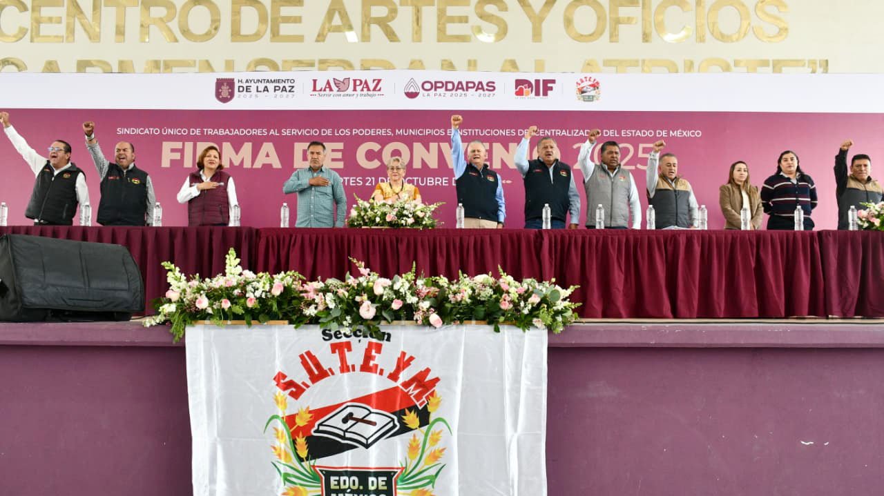 TOLUCA, Estado de México. – El Sindicato Único de Trabajadores de los Poderes. Municipios e Instituciones Descentralizadas del Estado de México (Suteym) y el Gobierno Municipal Constitucional de La Paz realizaron la firma del Convenio de Sueldos y Prestaciones Socioeconómicas del presente año; documento que refuerza los lazos interinstitucionales y da certeza laboral a las y los servidores públicos sindicalizados.