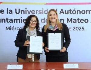 SAN MATEO ATENCO, Estado de México. – Con el propósito de fortalecer la vinculación entre la labor académica universitaria y el desarrollo local, la presidenta municipal Ana Aurora Muñiz Neyra y la rectora de la Universidad Autónoma del Estado de México (UAEMéx), Martha Patricia Zarza Delgado, firmaron el Convenio General de Colaboración que formaliza una alianza institucional estratégica.