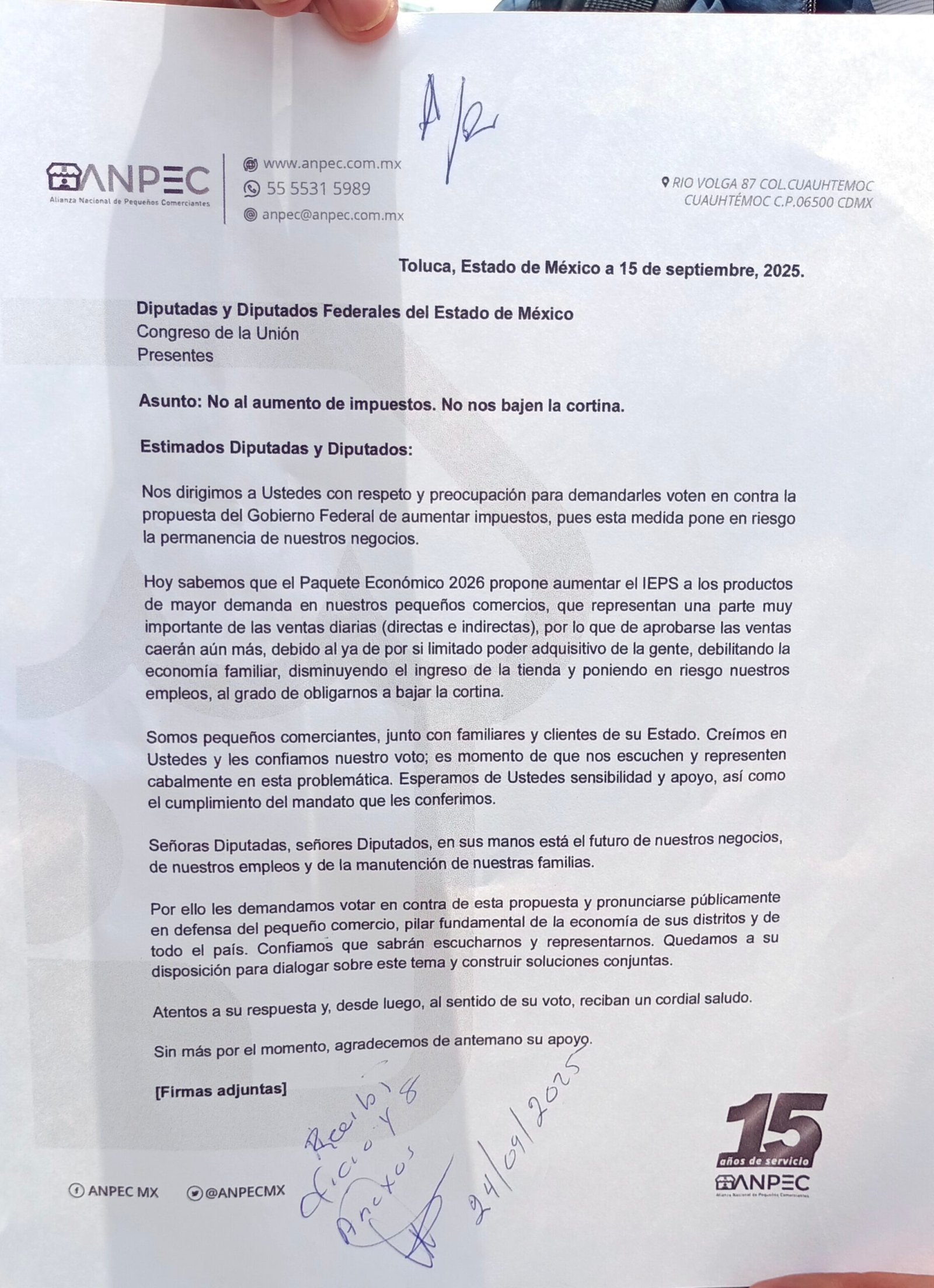 Lo anterior, añadió, les haría «bajar la cortina» de sus comercios, por ello, la manifestación y entrega de un oficio dirigido a diputados federales del Estado de México y Congreso de la Unión, pues, dijo: «en sus manos está el futuro de nuestros negocios, empleos y manutención de nuestras familias», en este sentido aclaró que esta protesta es sin algún tinte político.