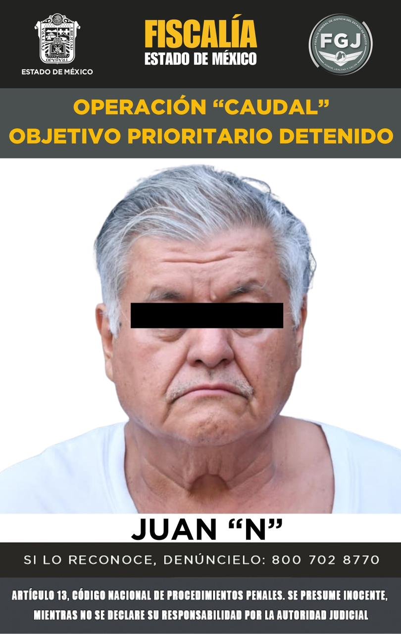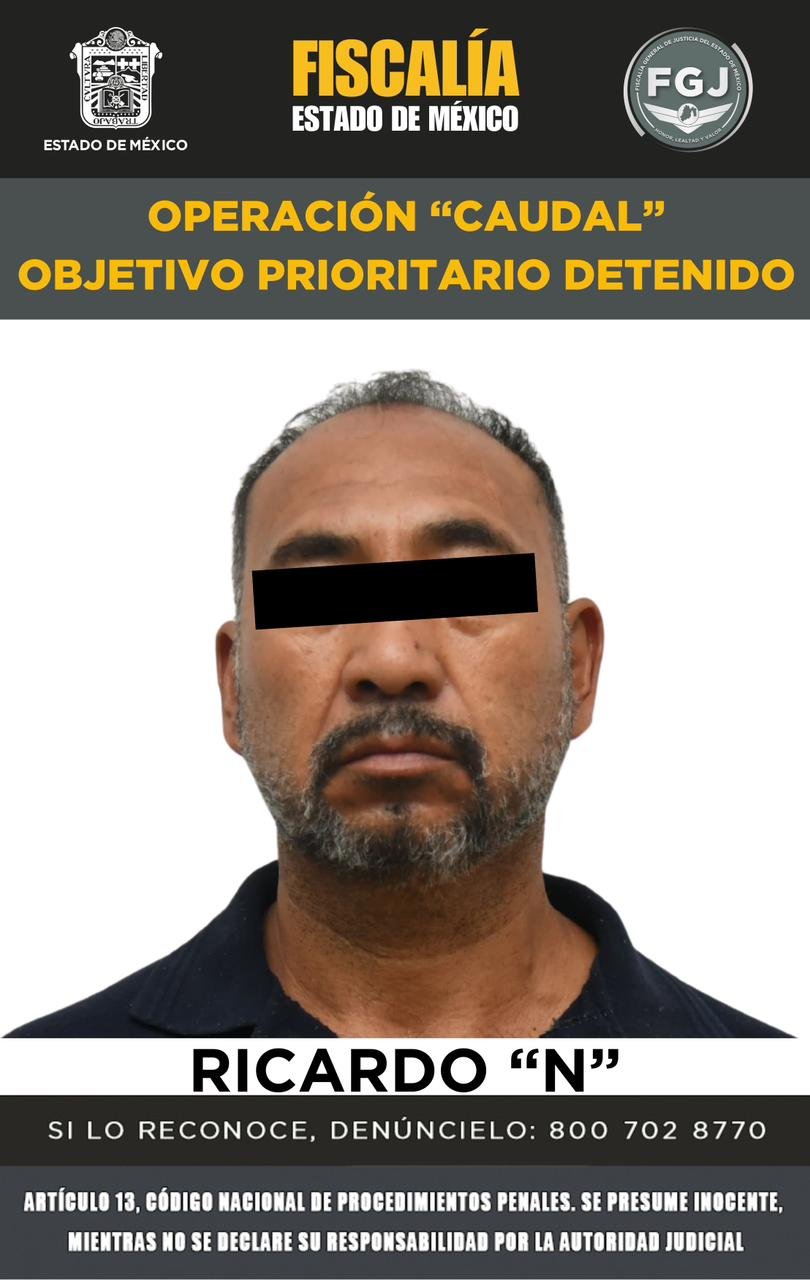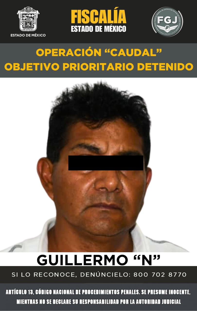 TOLUCA, Estado de México.- Elementos de la Fiscalía General de Justicia del Estado de México (FGJEM) detuvieron y cumplimentaron orden de aprehensión en contra de Cristian Jesús “N” alias el “Gimy” y/o “Jimmy”, Juan “N”, Guillermo “N”, Ricardo “N”, Juan Manuel “N” alias “El Maya” y María del Carmen “N”, identificados como objetivos prioritarios de la Operación “Caudal”, por su probable participación como ordenadores de actividades delictivas en la cadena ilícita de extracción, distribución y venta de agua en la entidad.