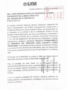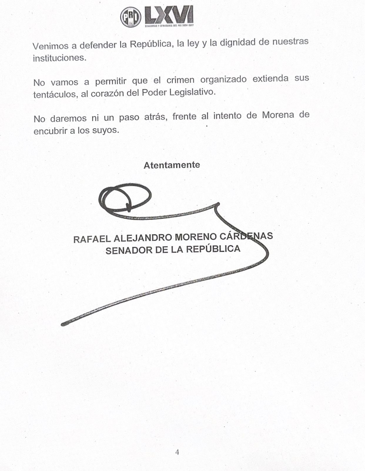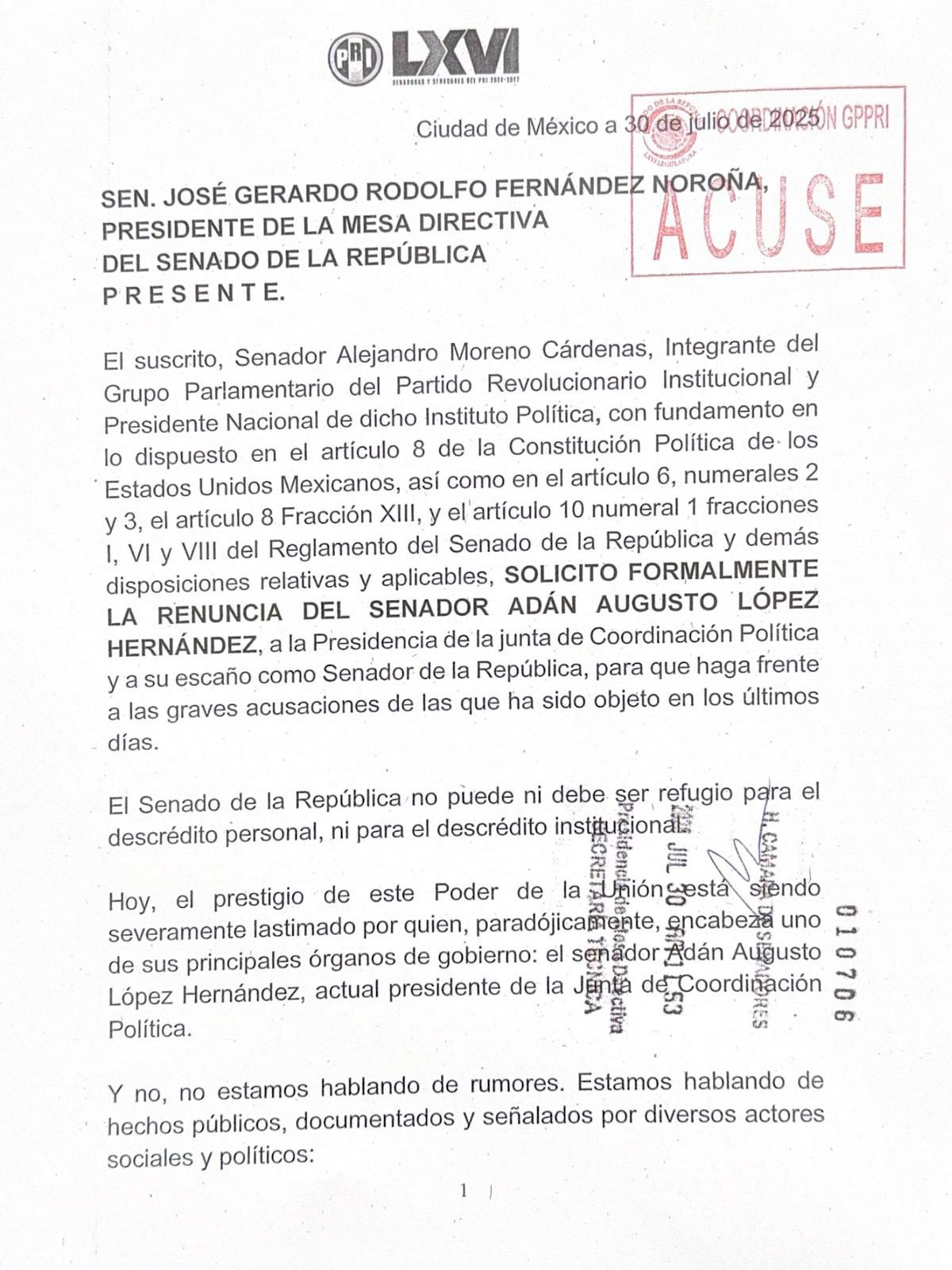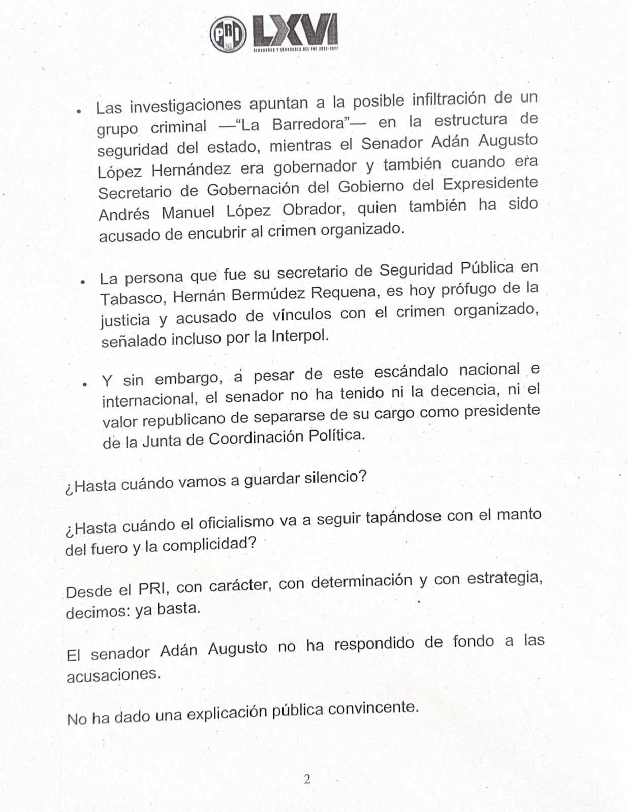 Informó que el PRI presentó denuncias penales ante la Fiscalía General de la República (FGR) contra gobernadores, exgobernadores, funcionarios, legisladores, el expresidente Andrés Manuel López Obrador y el senador Adán Augusto López Hernández, todos por presuntos nexos con el crimen organizado.