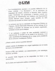 Señaló que existen actas constitutivas de siete empresas ligadas a Adán Augusto y a su exsecretario de Seguridad, Hernán Bermúdez Requena. “Familias que participaron presuntamente en los temas del crimen organizado y que están señaladas”.