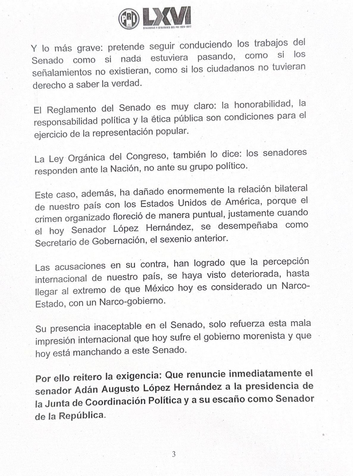 Sobre Adán Augusto López Hernández, exigió su renuncia inmediata a la Junta de Coordinación Política del Senado: “No solo fue el principal operador político del tristemente célebre corrupto y señalado por sus vínculos con el crimen organizado, Andrés Manuel López Obrador. Tabasco vivió un infierno y, como secretario de Gobernación, no pudo dar respuesta al crimen organizado”.