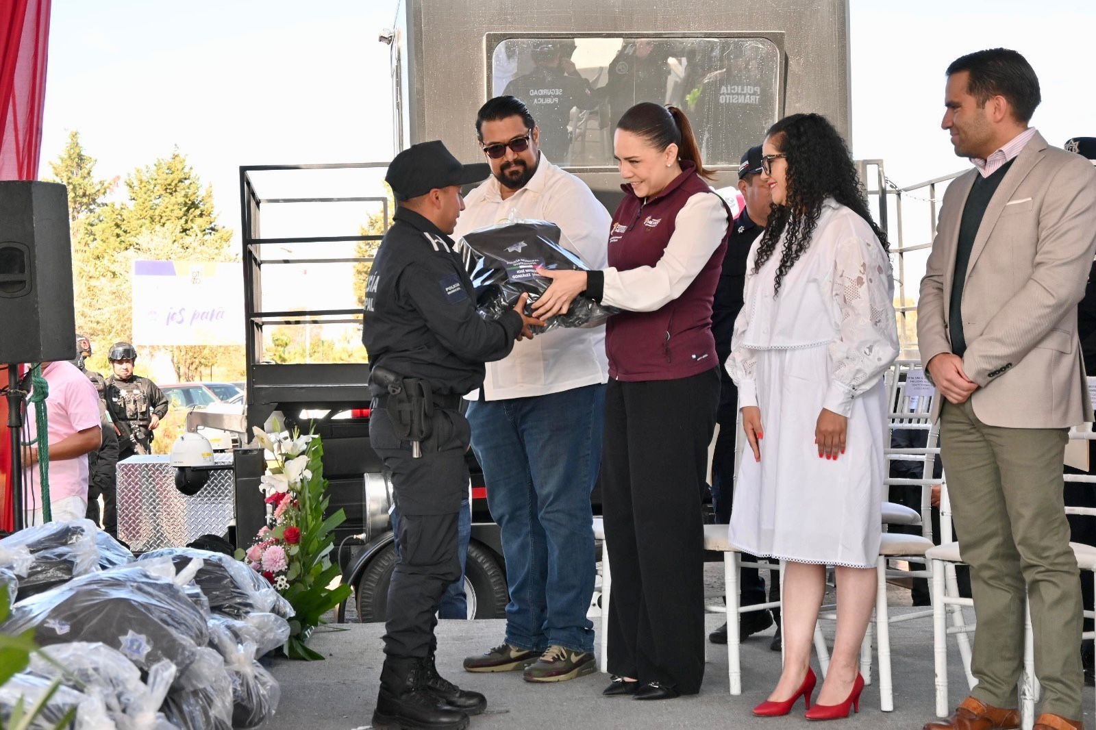 *Entregan torre de vigilancia móvil, una patrulla y retroexcavadora, además de equipo y uniformes a Seguridad Pública y Protección Civil.