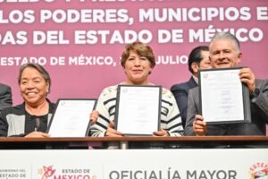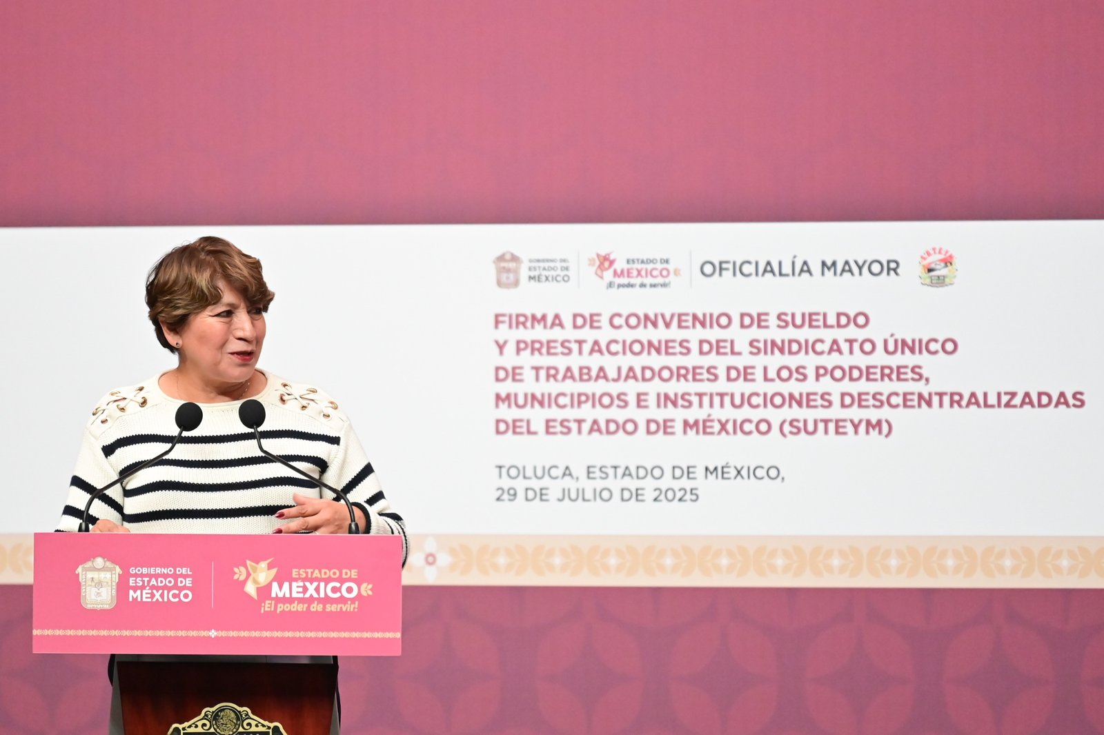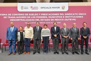 TOLUCA, Estado de México. – A fin de dar certeza laboral y seguridad económica de las familias mexiquenses, la Gobernadora Delfina Gómez Álvarez firmó el Convenio de Sueldo y Prestaciones 2025 con el Sindicato Único de Trabajadores de los Poderes, Municipios e Instituciones Descentralizadas del Estado de México (SUTEyM), en beneficio de más de 43 mil trabajadores. El acuerdo contempla un incremento salarial directo al tabulador y la mejora de diversas prestaciones clave.