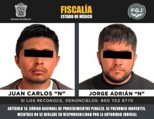 TENANGO DEL VALLE, Estado de México. – Elementos de la Fiscalía General de Justicia del Estado de México cumplimentaron una orden de aprehensión en contra de dos individuos identificados como Juan Carlos “N” y Jorge Adrián “N”, por su posible participación en el delito de robo de vehículo con violencia, encubrimiento por receptación y portación de arma prohibida.