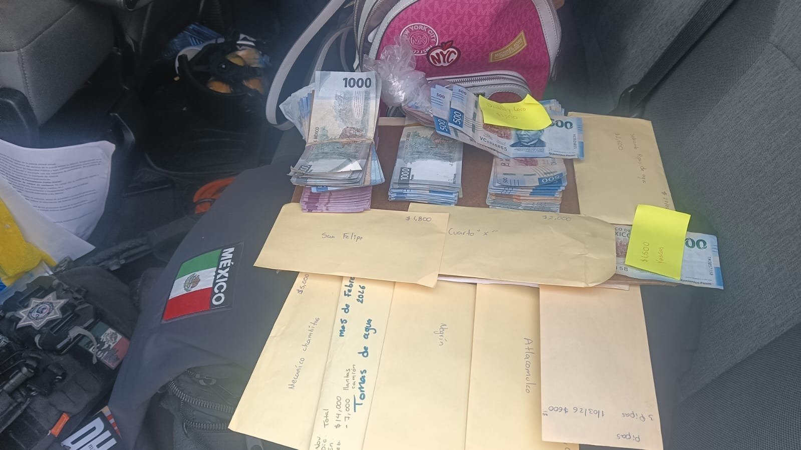 En la acción aseguraron 179 mil 270 pesos en efectivo, cuatro celulares, un laptop, dos vehículos, una libreta con aparentes anotaciones de pago de cuotas y posible droga.