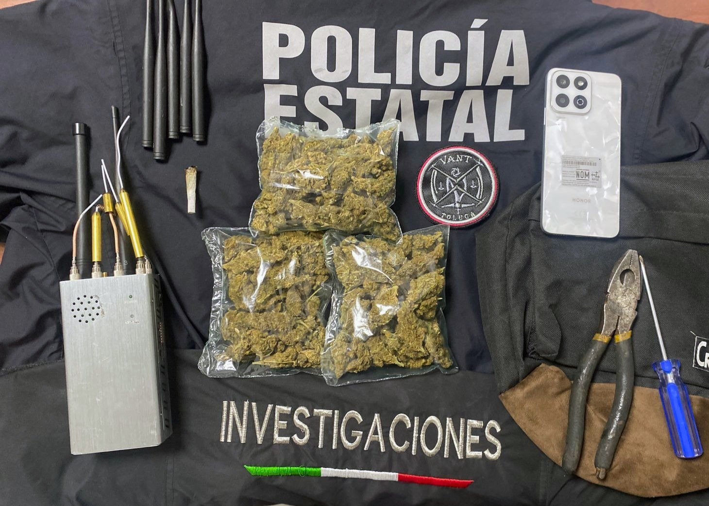 Apegados a protocolo de actuación los oficiales con comandos verbales le marcaron el alto al fin de realizar una revisión física a su persona, tras llevar a cabo la inspección hallaron entre sus pertenencias tres bolsas de plástico transparente, que en su interior contenían hierba verde y seca con características similares a la marihuana, un desarmador, unas pinzas eléctricas y un inhibidor de señales.