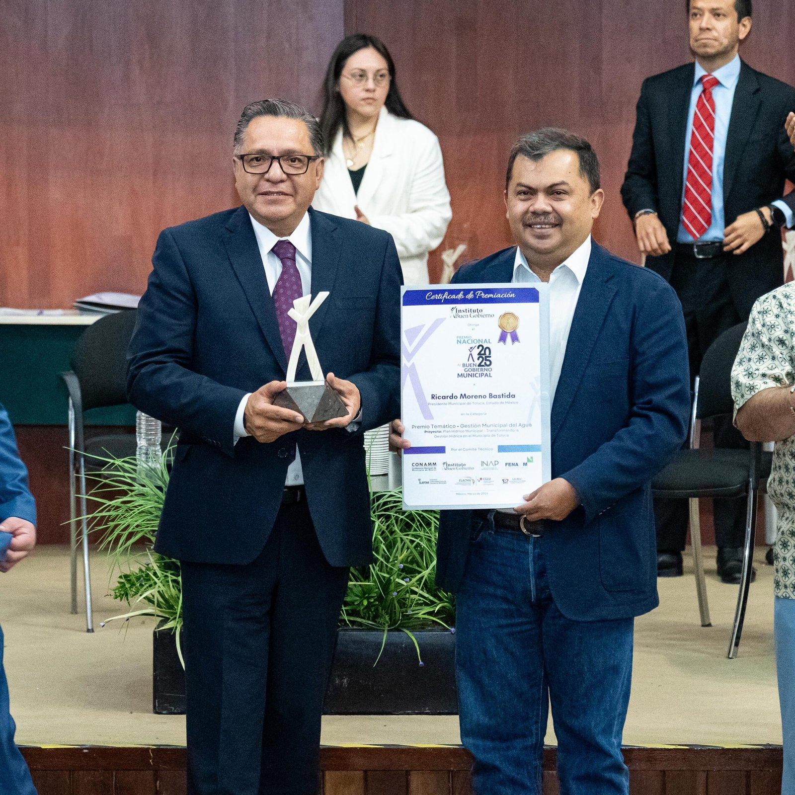 Durante la ceremonia del Premio Nacional al Buen Gobierno Municipal 2025, celebrada en la sede del Instituto Nacional de Administración Pública (INAP), el alcalde Ricardo Moreno agradeció la distinción y destacó el trabajo realizado en su gestión para enfrentar la crisis hídrica que vive la capital mexiquense en años recientes.