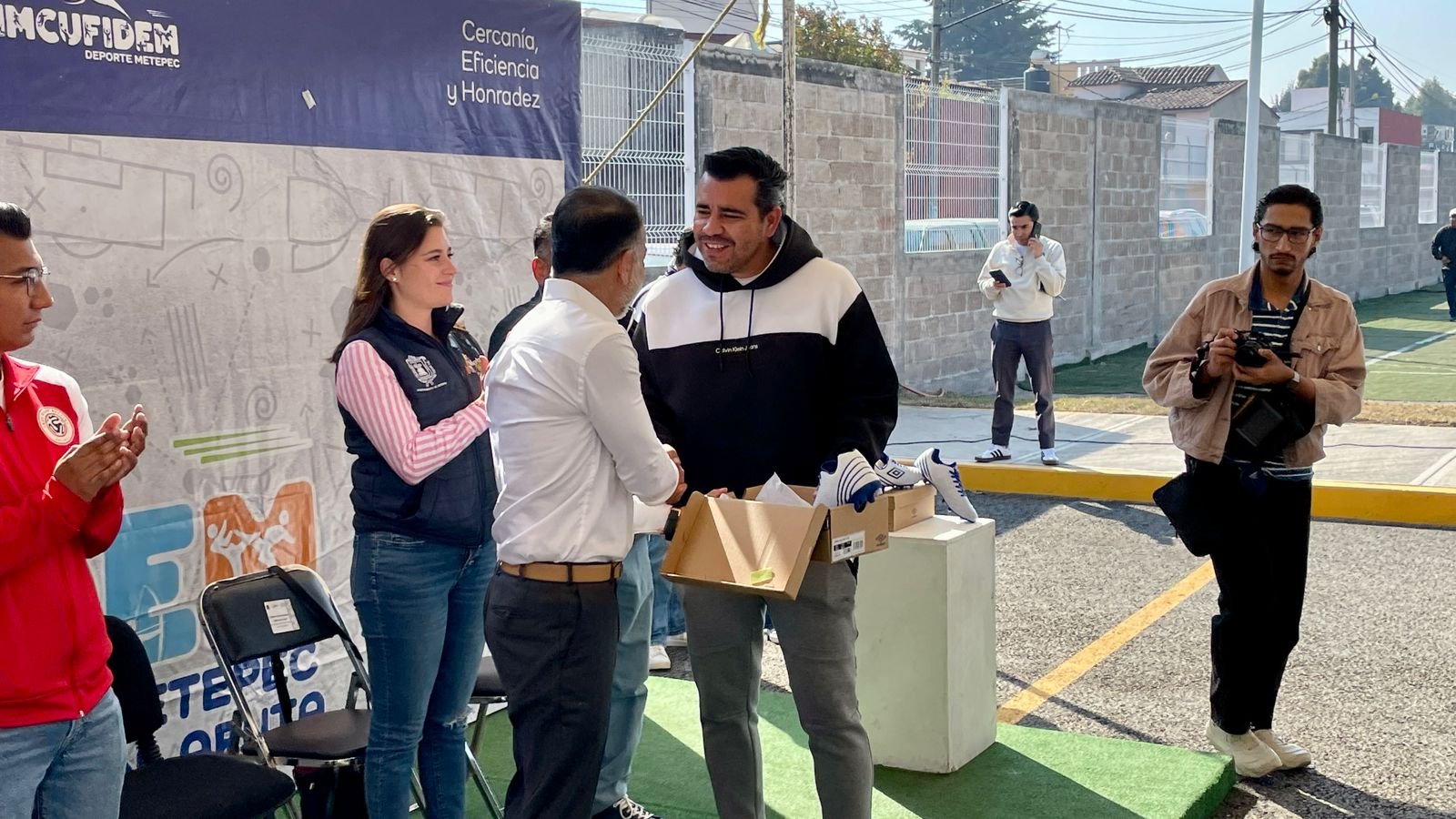 METEPEC, Estado de México. – El presidente municipal de Metepec, Fernando Flores Fernández, entregó calzado deportivo a miembros de las diferentes ligas de fútbol, como parte del Programa “Ponte tu Tachos”, respondiendo así a uno de los compromisos de campaña.