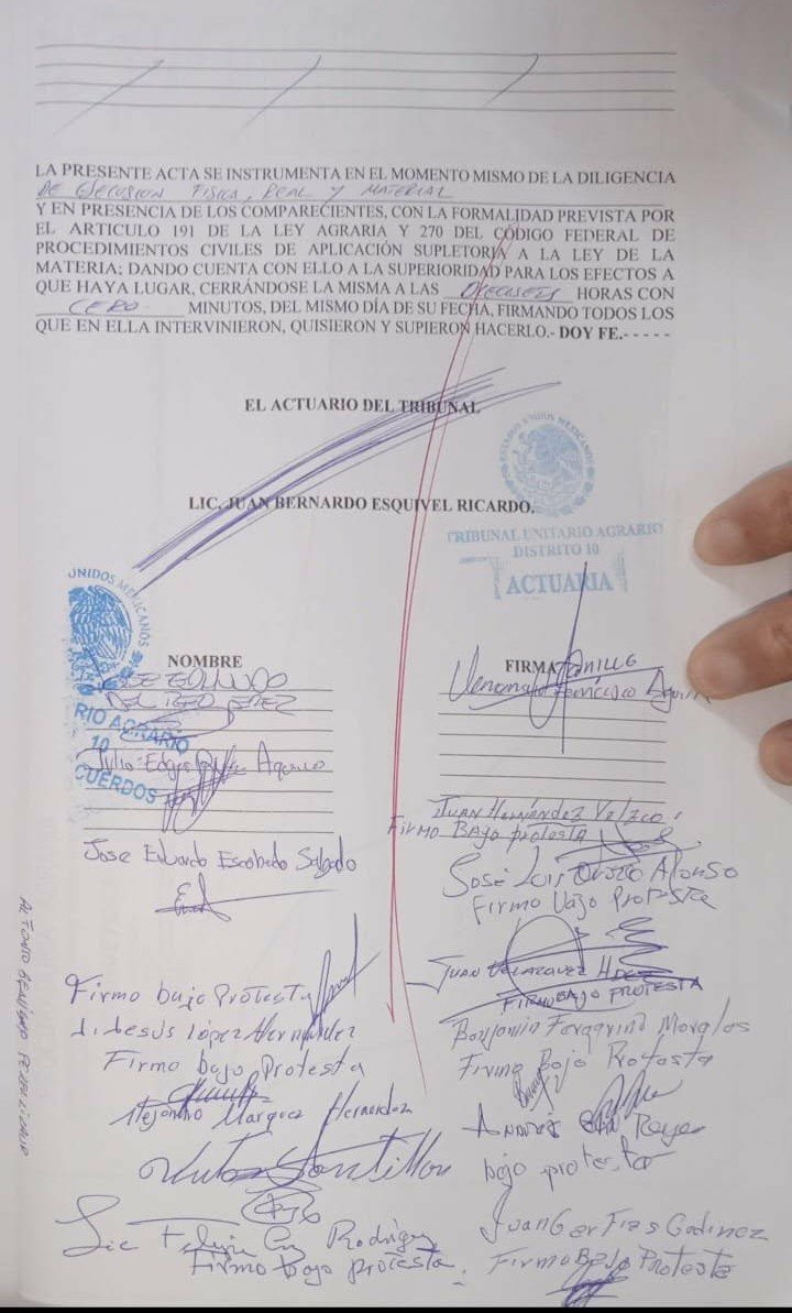Añadieron que, durante la diligencia, el actuario se negó rotundamente a que los ejidatarios le tomaran fotografías al acta “que había levantado” durante el proceso de deslinde de los terrenos, bajo el supuesto argumento de que no lo permitiría porque “no estaba en sus facultades”.