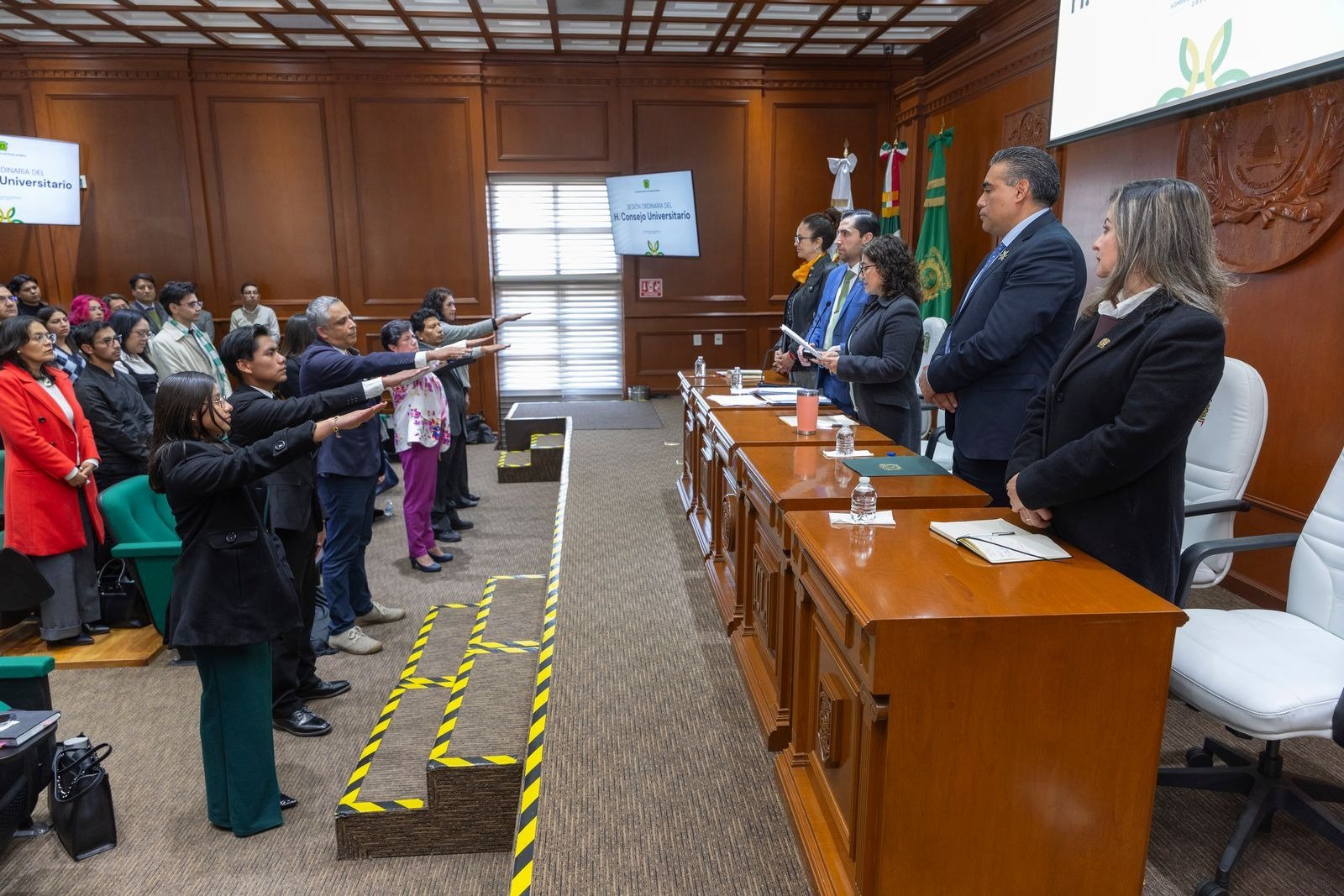 Durante la sesión, el pleno también tomó protesta a los nuevos consejeros representantes del personal académico de las facultades de Ingeniería y de Medicina Veterinaria y Zootecnia, así como de la comunidad estudiantil del Plantel “Cuauhtémoc” de la Escuela Preparatoria.